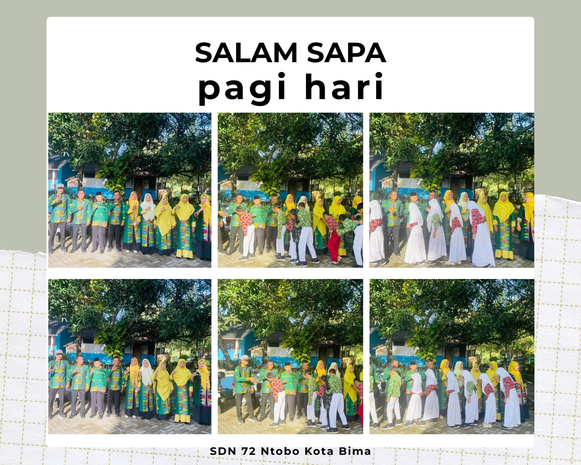 Suasana hangat dan penuh kebersamaan terlihat pada pagi hari di lingkungan SDN 72 Ntobo Kota Bima yang berada di Kota Bima. Para guru berdiri di halaman sekolah untuk menyambut kedatangan siswa-siswi yang datang memulai aktivitas belajar.
